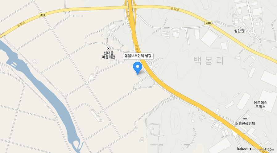 오시는 길 행강은 여러분들의 작은 관심과 사랑으로 운영되고 있습니다. 행강 동물 보호소를 방문하고 싶으신 분들은 아래의 연락처를 통해 연락을 주시고 방문해 주세요. 로드뷰길찾기지도 크게 보기 도로명주소:경기도 용인시 처인구 백암면 죽양대로 891-16 구번지주소:경기도 용인시 처인구 백암면 백봉리 1623번지 행강유기견보호소.행강 유기동물 입양센터. T.031-333-0729. F.031-333-0881